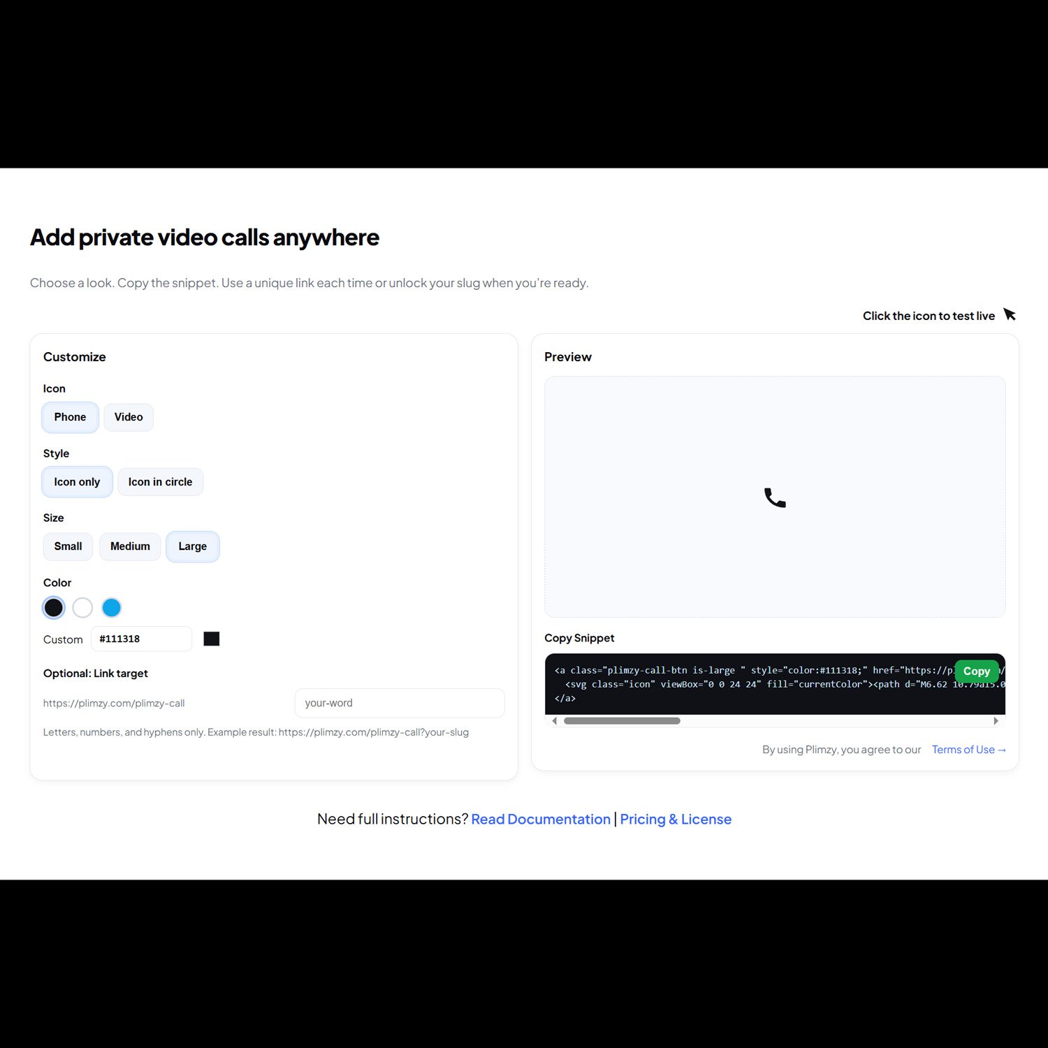 Drop-in plugin to embed instant, account-free private calls on any website or inside your own app or chat platform.